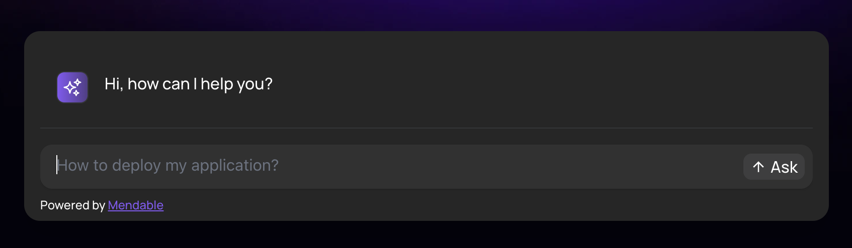 | hintText | string | "Search" | Placeholder text of the mendable bot input. |